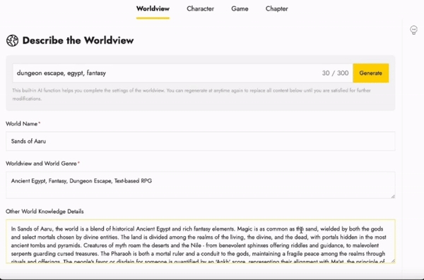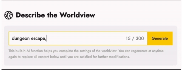 After submitting a text prompt, the AI agent processes your request, creating a unique worldview within 30 seconds. Click โOKโ to automatically fill the information into the designated boxes. If the results arenโt to your liking, feel free to regenerate.